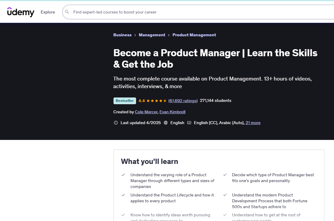 Become a Product Manager on Udemy is a go-to course if you want a clear path into the product world. It’s beginner-friendly but packed with value. The course provides practical lessons that are perfect for understanding how real software products are built and managed. You’ll pick up the skills you need to lead teams, build strategies, and make smart decisions. Best of all, you’ll earn a certificate at the end, which can help open up new job opportunities. Let's just say it's a solid first step toward a career in product management.